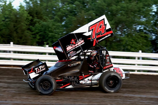 Xavier Doney, ace of the Design Source Flooring, Schnee-Lawson Chassis, Motor Haven, MVP Logistics, T&T Equine, Prime Composite, Steve & Mandy Griffin Family, JDLawsonMedia, Stanton Racing Engines, No. 74 sprinter, earned each of the aforementioned top-tens, climbing ten spots to finish tenth in Friday’s POWRi 410 Outlaw Sprint League A-Main, followed by a ninth-place score in Saturday’s WAR non-wing A-Main. In fact, Doney was well on his way to a top-five in Friday’s WAR main event, that until a steering issue sent the Odessa, Missouri, native to the tail; he was racing in the third position with seven laps recorded.